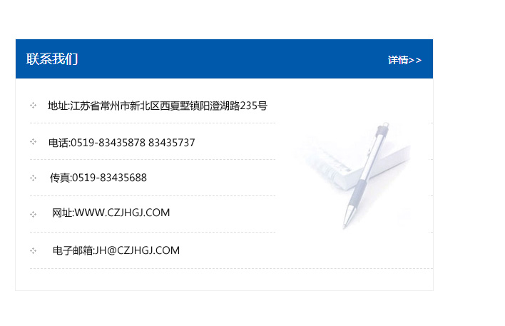 傳真:0519-83435688    郵編:213135    網址:WWW.czjhgj_com.cnzhengxu.com    電子郵箱:JH@czjhgj_com.cnzhengxu.com